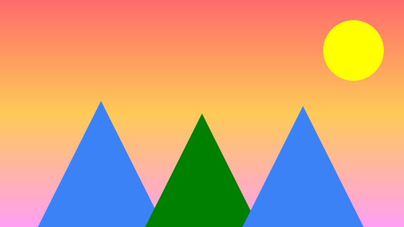 /scene-layout-grid-w-600-h-400-x-400-y-225/circle-c-red-s-120-shadow-medium/square-c-blue-s-120-shadow-medium/triangle-c-green-s-120-shadow-medium/star-c-yellow-s-120-shadow-medium/heart-c-pink-s-120-shadow-medium/hexagon-c-purple-s-120-shadow-mediumA simple but effective mountain landscape using triangles and gradients. Nature-inspired design.